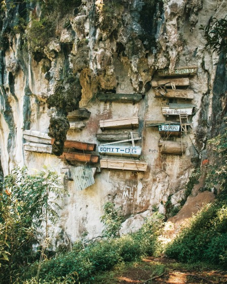崖につるされた棺桶。この風習は山岳民族イゴロットの人々によって2千年以上前から行われていたという。高所に埋葬することで先祖の霊に近付けると信じ、また遺体を首狩り族や野生動物から守るために崖につるしたとされる。