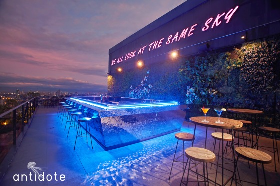 最上階のアンティドート・バー は、フィリピン初のクラゲをテーマにしたルーフトップバー。クラゲがゆっくり漂い、幻想的に光る水槽と360度を見渡す夜景に包まれていると、心がほぐれるようにリラックスできます。平日はアコースティックBGM、週末はDJによるハウスビートを楽しめます。カクテルやタパスメニューに舌鼓を打ちながら、音楽と味覚の共演を堪能してください。