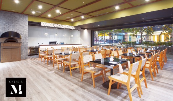 オステリア Mは、穏やかで落ち着いたムードを醸し出すBGMに、週末にはサックスやギターの生演奏を聴きながら食事を楽しめるスポットです。フィリピンとイタリアの食文化が出会い、自家製ピザや手打ちパスタ、さらに地元食材を活かした創作料理をそろえています。