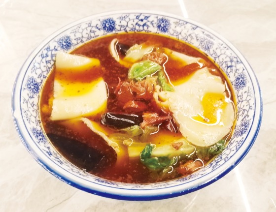 初めてこの牛肉板面を見たとき、麺というよりも薄切りの餅が浮かんでいるのかと思いました。その幅3~5センチ。幅も長さもばらばらなのは、手作りの証拠。中国西北牛肉拉面は、刀削麺が楽しめる店として知られています。刀削麺の発祥は中国・山西省。先に紹介したビャンビャン麺の陝西省の隣です。この地域は幅広麺の聖地なのかも。シンガポールやマレーシアにも板面がありますが、これほどの幅広麺は見たことがありません。